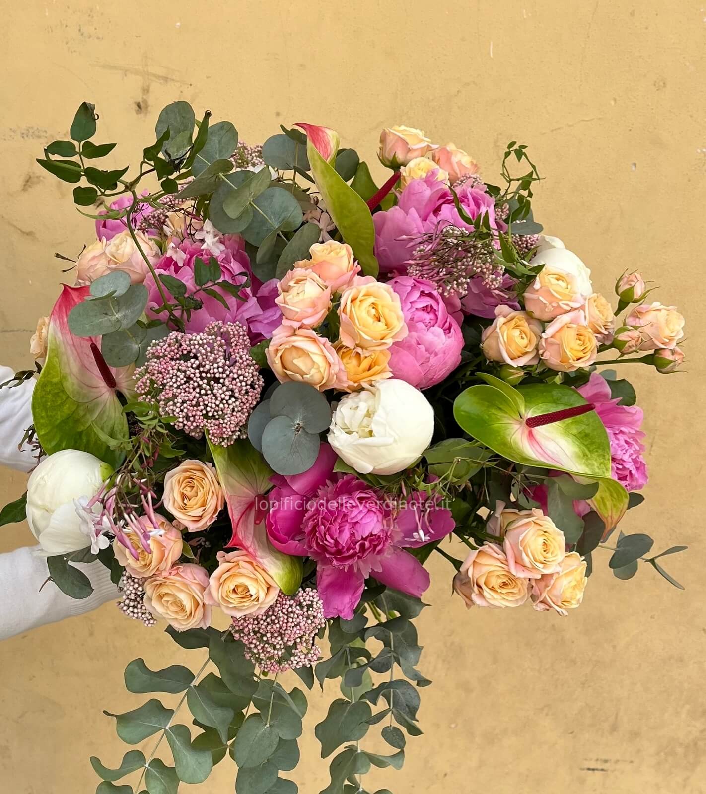 Uno spettacolare bouquet gigante , con rose, Roselline, peonie ed altri fiori misti , in base alla stagionalità.